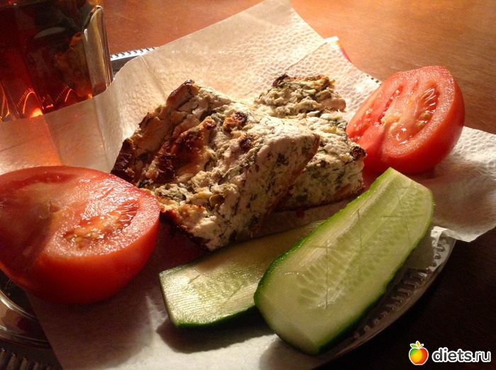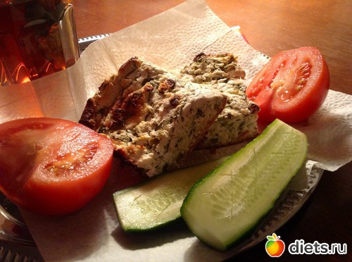 Потом вернулась, вскипятила чайку и поужинала припасенной диетической запеканкой из творога с зеленью, огурчиком и помидорчиком, Олик котик и молодец!!!