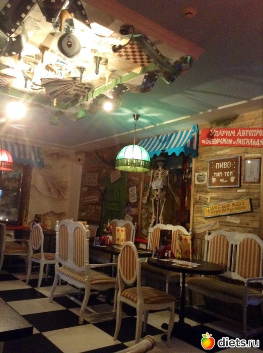 Пол в чёрно-белую клетку и выгнутые ножки стульев в кафе напомнили мне кадры любимого мультика ’Алиса в Зазеркалье’.