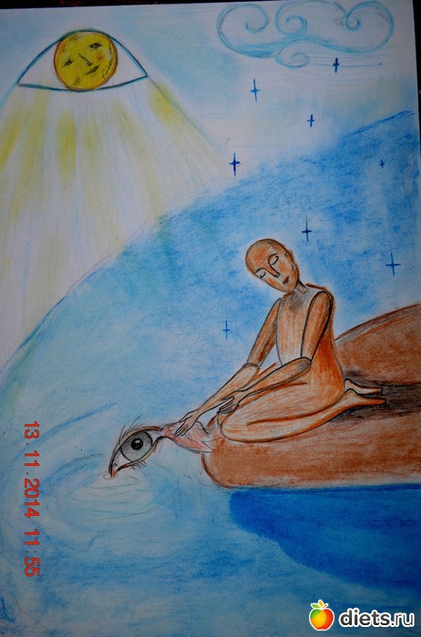 Глаз вверху в космосе....Человек с закрытыми глазами(у него взор обращён внутрь себя) опускает рыбу-глаз в воду....