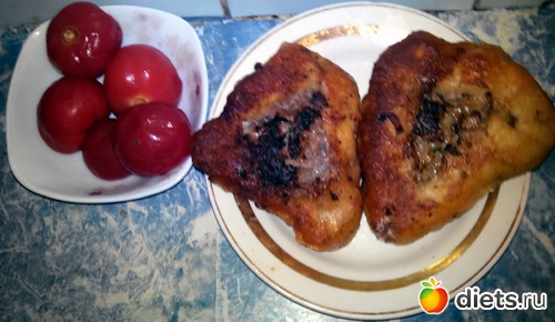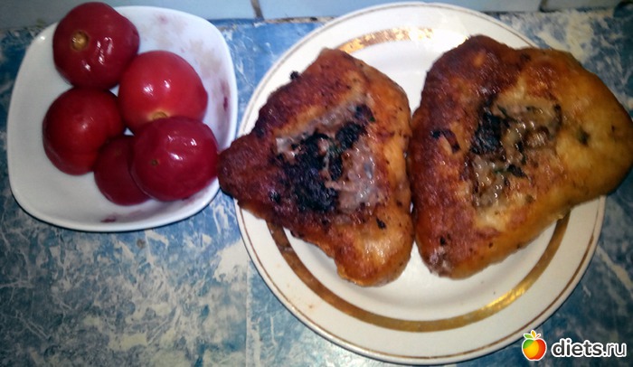 Маринованные помидорки и пара свежайших беляшей. Они, кстати, получились очень легкие - никакой тяжести на желудке.