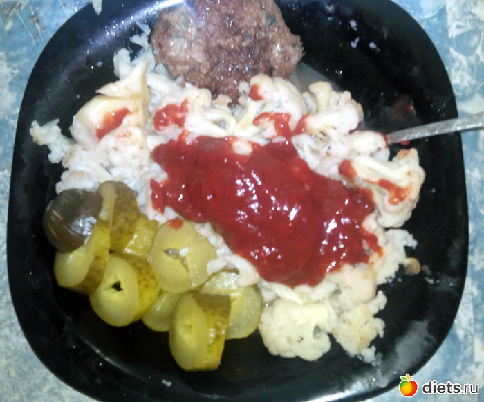 Маринованный огурчик, цветная капуста с томатным соусом и котлетка из остатков фарша для беляшей.