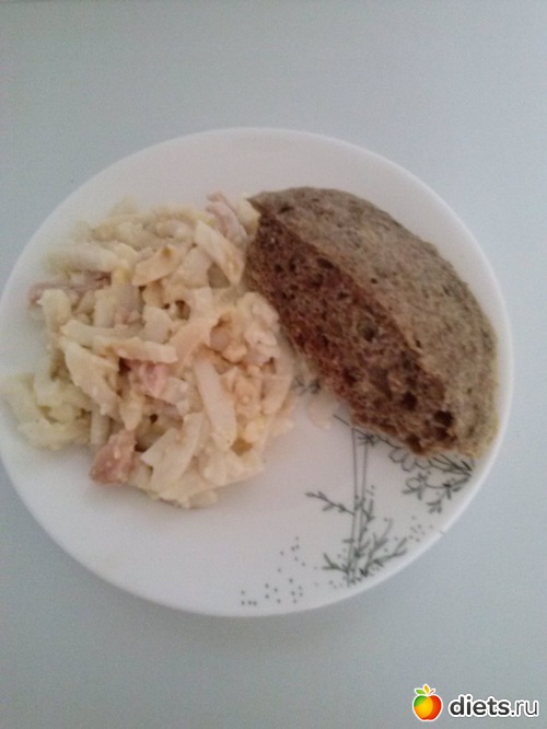 Салат из кальмара, яйца, постной ветчины, заправленный дюкановским майонезом(2 отваренных кальмара, яйцо в крутую, постная ветчина. Порезать соломкой, заправить дюкановским майонезом), хлеб из овсяных отрубей(3 с.л. отрубей,3 с.л. обезж. творога,3 ч.л.обезж. кефира,1 яйцо,1 ч, л разрыхлителя. Все перемешать и в микроволновку на 5 мин.)