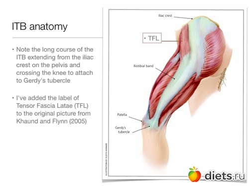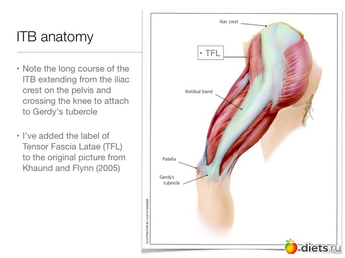 Если основная и второстепенные движения мышцы активно не тренируются, но все равно вовлекаются в движение, то неэффективность и слабый перформанс – это наименьшие из ваших проблем. Неправильный паттерн (грубо говоря, привычка выполнять то или иное движение определенным образом, - прим. Belle_Amor), который мы все пытались исправить у наших клиентов – это глубокий присед. Когда боковая цепь нижней части тела (напрягатель широкой фасции/ подвздошно-большеберцовый тракт: смотрим на картинку – TFL/ITB соответственно, прим. Belle_Amor) стянута и зажата окружаюшими тканями, происходит значительная компенсация, такая как сведение коленей внутрь. Эти «липкие» мышцы приводят к тому, что ты буквально работаешь сам против себя и создаешь серьезные дисфункции, что может привести рано или поздно к ортопедическим проблемам.