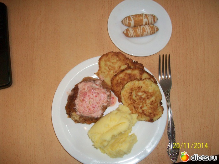 На завтрак была съедена куриная рубленая котлетка с аджикой, картофельное пюре и оладушки из кабачков. На десерт съела последние две печеньки, было вкусно