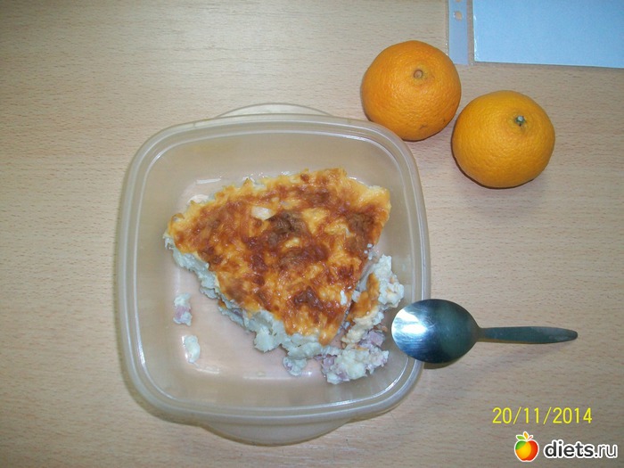 На обед была моя вчерашняя запеканка из цветной капусты, ветчины, с соусом из сметаны и яйца, сверху посыпанная сыром, на десерт две мандаринки.