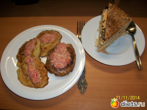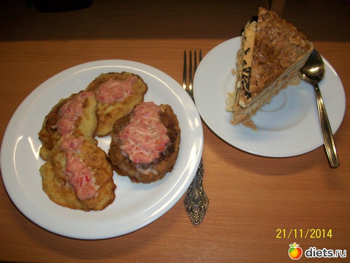 Завтракала сегодня вкусно и с удовольствием. Последняя куриная котлетка, три оладушка из кабачка и кусок наивкуснейшего, свежего тортика