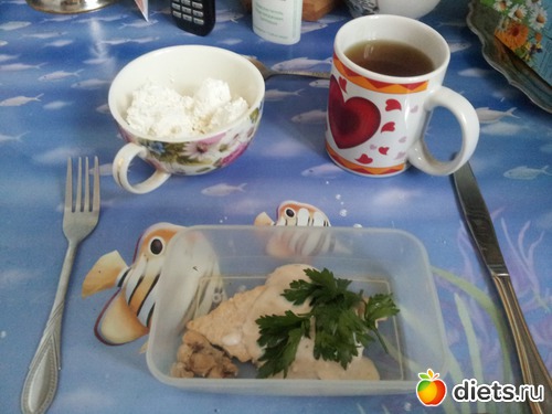 Обед 13.00 Жареная куриная грудка с соусом, творог обезжиренный, травяной чай