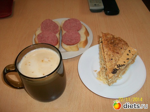 Утренний стакан воды, был мной благополучно прощен и забыт на сегодняшний день, т.к. время уже неумолимо приближалась к десять утра, быстренько умывшись побежала на кухню завтракать, а завтрак меня сегодня радовал бутербродами с колбасой, кусочком торта и стаканом каппучино, все было очень вкусно