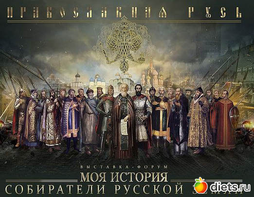 При входе на выставку - икона - Сергий Радонежский. Почему-то именно он стал ц ентральным персонажем всей инсталляции, хотя каким образом он относится к Рюриковичам мне очень непонятно. Радонежскому посвящен центральный павильон выставки - огромный, круглый свод. даже и побольше свода святой Софии Константинопольской. Помимо обычной экспозиции и электронных информационных стендов, выставка включает в себя 4 кинозала, где непрерывно идут короткие тематические киносюжеты - о крещении Руси, о строительстве городов и освоении территорий, о ратных подвигах и сражениях русичей. Как-то навязчива идея о том, что все русские победы и достижения исключительно результат религиозного чуда и Божественного провидения. Удивило еще и трактование о Киеве, его почему-то назвали Самбасом, якобы от древнееврейского,
