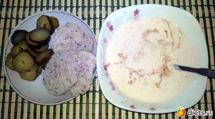 Геркулес с ряженкой, самодельная колбаса и... маринованный огурец.