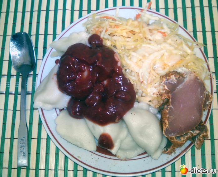 Вареники! Ровно десять штук! Специально проверил - десять вареников это как раз порция размером с блюдце. Квашеная капуста и вяленая грудка. На варениках тот самый самодельный томатный соус, который я уже несколько раз упоминал.