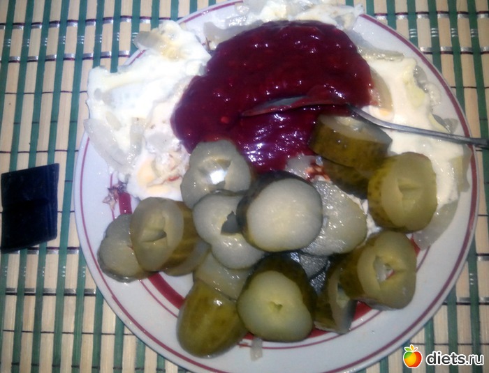 Яичница из двух яиц с луком. Очень уж захотелось именно так приготовленные яйца. Я ее сейчас редко ем, но, иногда, все-таки хочется. И маринованные огурцы. Тот же самый соус и чуточку шоколада. Горького.
