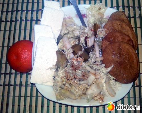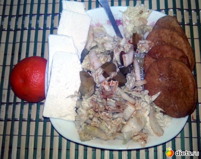Что-то вроде салата из пекинки и соленого огурца. Брынза, крекеры из ржаной муки и мандаринка.