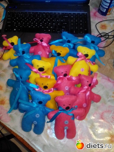 А вместо того чтобы дрыхнуть без задних лап и с чистой совестью пока муж в Луганске, я готовлюсь к Новому Году. Шью вот таких мишек (уже готово 14 штук, еще 4 раскроено и новая партия фетра и синтепон закуплены) будем с Лерой раздавать перед Новым Годом
