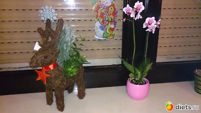 А это часть подарка свекрови на ДР - олененок (пока стоит на окне, потом переставлю вниз, как елочку поставим) и орхидея