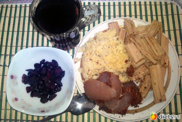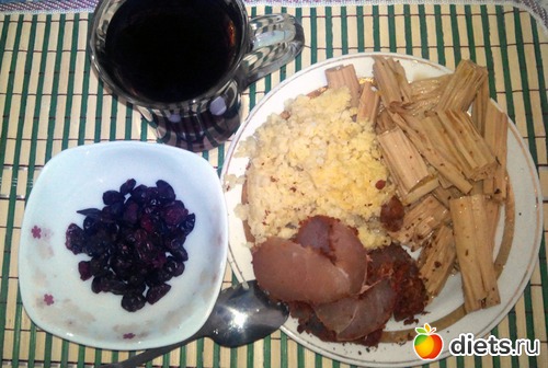 Пшено, соевая спаржа, вяленая грудка. Немного обнаруженной в шкафу вяленой клюквы и чай.