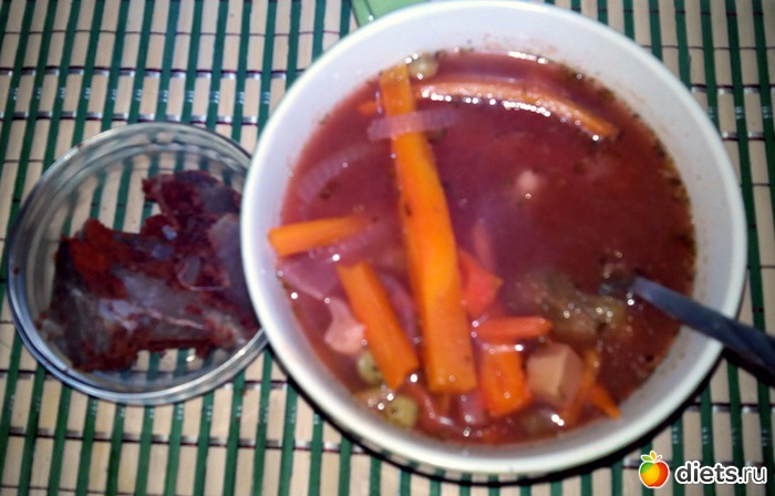 Обнаружил в морозилке куриные косточки, оставшиеся с тех времен, когда я делал колбасу и сварил бульон. А еще, там же, нашелся пакет с заморозкой - смесь "Весенняя". Плюс остатки моркови, лук и томатной пасты. Из всего этого я и сварил овощной суп... Плюс еще несколько кусочков вяленой грудки. Ее изобилие тоже от безденежья.