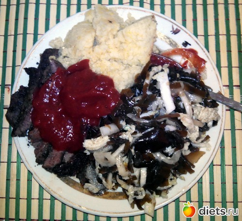 Пшено. Салатик соорудил из пекинки, лука и морской капусты. И быстро обжаренный стейк из говядины, нарезанный на тонкие полоски, чтобы жевать было легче. Эх-х-х... Это был последний кусочек...