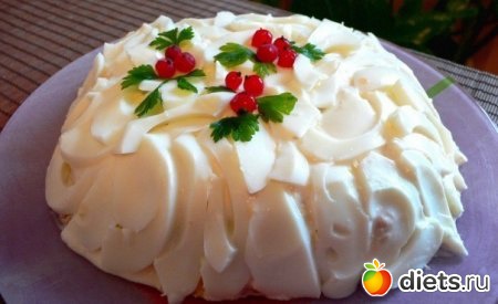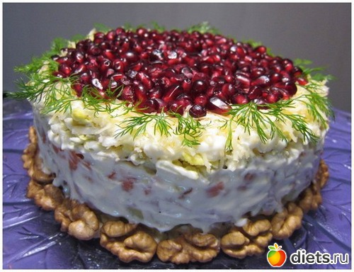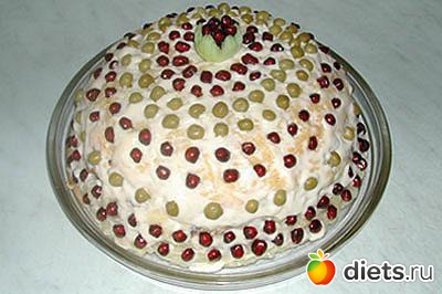 Весь купол промазать тонким слоем свежего майонеза и украсить зернами граната и зеленым горошком. (Если салат украсить сразу после приготовления и оставить пропитываться на несколько часов, зеленый горошек высохнет и сморщится.)