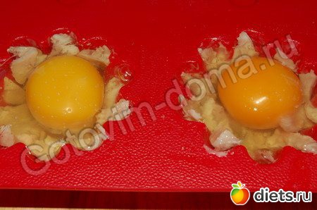 Сверху на курицу разбить яйцо, посолить, поперчить и поставить в духовку