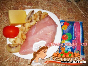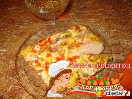 Если вы решите делать блюдо в духовке, то перед тем как приступить к приготовлению, поставьте ее нагреваться. К тому моменту, как вы будете готовы заложить блюдо в духовой шкаф, он как раз прогреется до нужной температуры в 200 – 220 градусов. Сочность филе сохраняется благодаря толстой шубке из грибов, сыра и помидор. К тому же в процессе выпекания сок томатов впитывается в филе и удерживается там. Вот так просто и быстро можно приготовить вкусную куриную грудку.