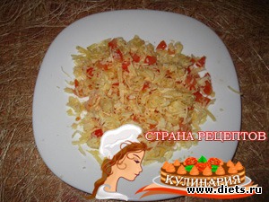 Любой твердый сыр натираем на мелкой терке. Мелкими кубиками нарежем красный помидор. Смешиваем помидор с сыром.