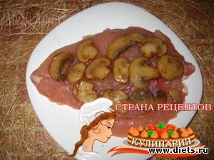 Теперь выкладываем шампиньоны на филе. Это будет первый слой.