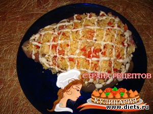 Далее покрываем мясо шубкой из помидоров и сыра. Тем, кто любит маслины: можно порезать маслины на колечки и добавить в «шубу». Они не испортят красоты блюда и добавят пикантного вкуса. Теперь берем майонез и немного надрезаем уголок упаковки. Лучше это делать на маленьких упаковках (100 - 150 гр), так как на них не ставится туба с крышкой. Делаем из майонеза тонкую сеточку.