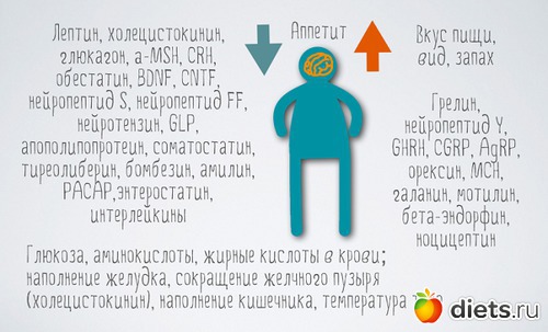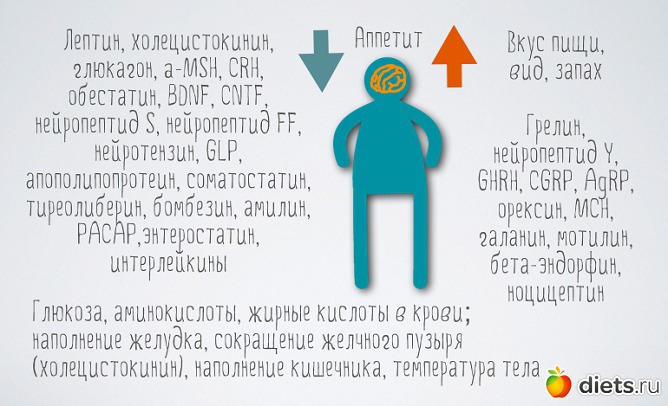 Учитывая, что измерять процент жира напрямую гипоталамус не может, ведь калипер или DEXA-сканирование ему не доступны, он собирает информацию из множества различных источников (гормоны, нейромедиаторы, уровень глюкозы и других химических веществ в крови) и в конечном итоге превращает все это либо в аппетит, либо в его временное отсутствие.