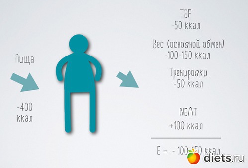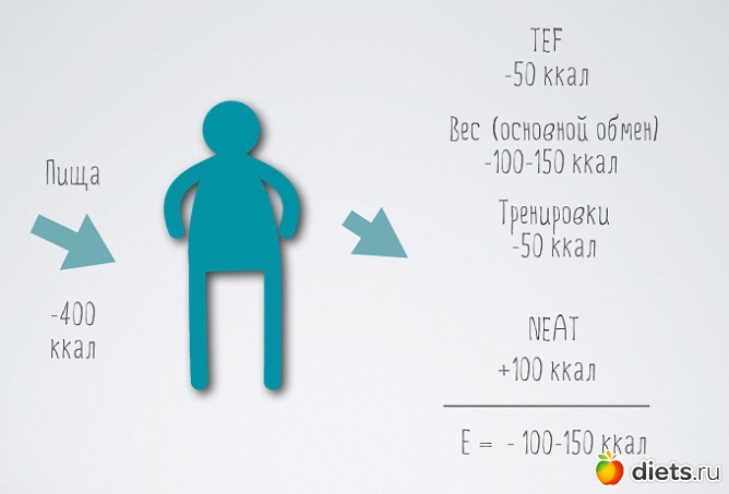Снижение трат на TEF составит в таком случае около 50 ккал; после снижения веса на тех же 5 кг (на это понадобится чуть больше времени, около 2-2,5 мес) снижение основного обмена составит около 100-150 ккал; тренировки можно совершать примерно в той же интенсивности, и практически не потерять расходную часть за их счет, с учетом дополнительного часа в день пеших прогулок траты калорий возрастут на 200 ккал, но пусть несколько снизится другая спонтанная двигательная активность и мы получим лишь дополнительные 100 ккал затрат.