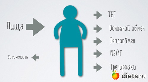 Снижение калорийности рациона автоматически снижает термический эффект пищи. Если она стала есть на 800-1000 ккал меньше пищи, то она перестает тратить энергию на ее переваривание, а значит, 10% от этой калорийности (80-100 ккал) следует вычесть от ее привычного TEF.