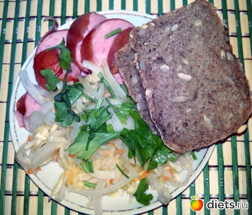 А-а-а-а!!! Цельная шпикачка!!! Да! Я такой! Однако, если она идет в сопровождении квашеной капусты и пары маленьких кусочков хлеба, я не думаю, что калорийность данной еды будет зашкаливать. Что-то около четырехсот килокалорий. И не надо мне долго и нудно рассказывать какая она плохая! Этикетки я читать умею! Но вот захотелось! Видимо, потребовалась перемена вкуса.
