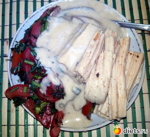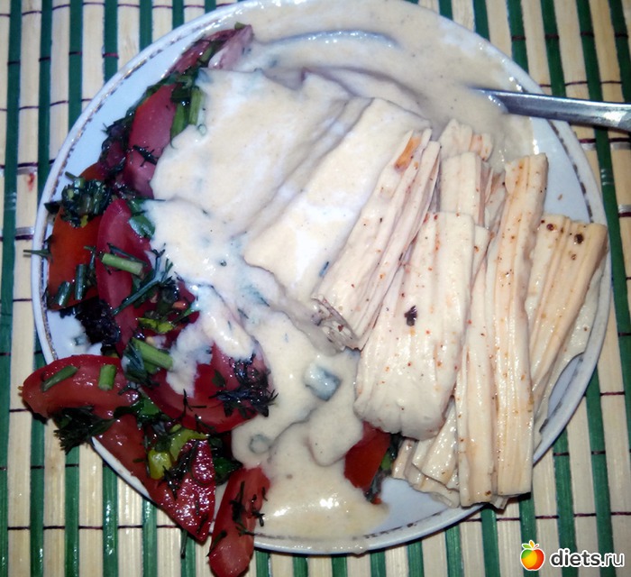 Соевая спаржа, помидорка с зеленью и сверху нечто вроде соуса из ряженки и горчицы.
