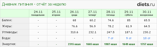 Прошла неделя разминки, итог потеря 500 грамм, по сути весьма не плохо, с учётом того что я себе в принципе ни в чем не отказываю, кушаю как кушала. Слегка приуменьшила порции, в чем мне помогли кухонные весы и дневник питания на сайте. Единственное ограничение на сладостях и вкусншках, кондитерка под домом это зло .