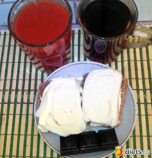 Томатный сок, чай, пара бутеров с маслом и козьим сыром. Кусочек горького шоколада.