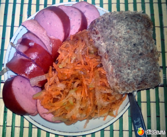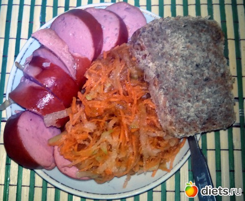 Обещанная шпикачка. Последняя! Сегодня сделал колбасу и запасся творогом и яйцами. Салат из редьки и моркови. Заправлен соевым соусом, яблочным уксусом и льняным маслом. Кусочек хлеба. А вот хлеб интересный. Как написано на этикетке, он изготовлен из пророщенной пшеницы. Плюс вода, соль и дрожжи. Калорийность у него 210 кк. И не такой уж и дорогой. 15 рублей за 250 граммовую буханочку.