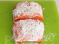 Что делать:Филе рыбы разрезать на 2 части, посолить, поперчить. Обвалять каждый кусочек в муке. Обжарить подготовленное филе на оливковом масле по 2 минуты с каждой стороны. Помидоры ошпарить кипятком, снять кожицу, разрезать пополам, посолить.