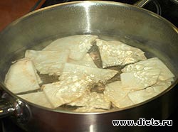 Нарезать небольшими брусочками (около 1 см толщиной) или пластинками. Отварить в кипящей подсоленной воде в течение 7-10 минут. Слить воду и