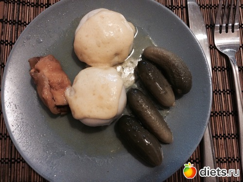 2 хинкали под сыром, бабулины огурчики, 1 маленький оставшийся куриный рулетик на пару с курагой
