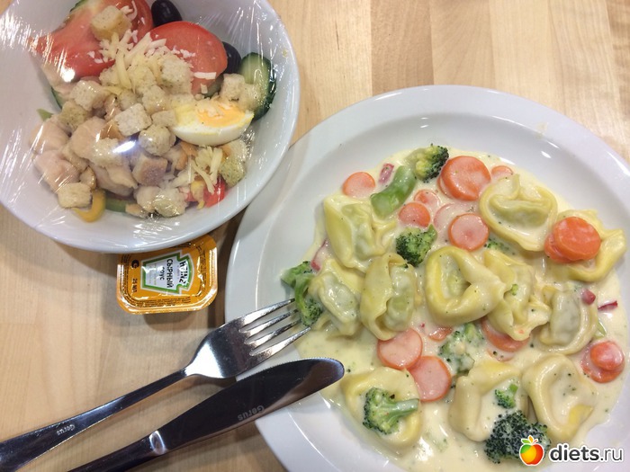 Я съела тортеллини с сыром в овощном соусе, салат с курицей и сыром