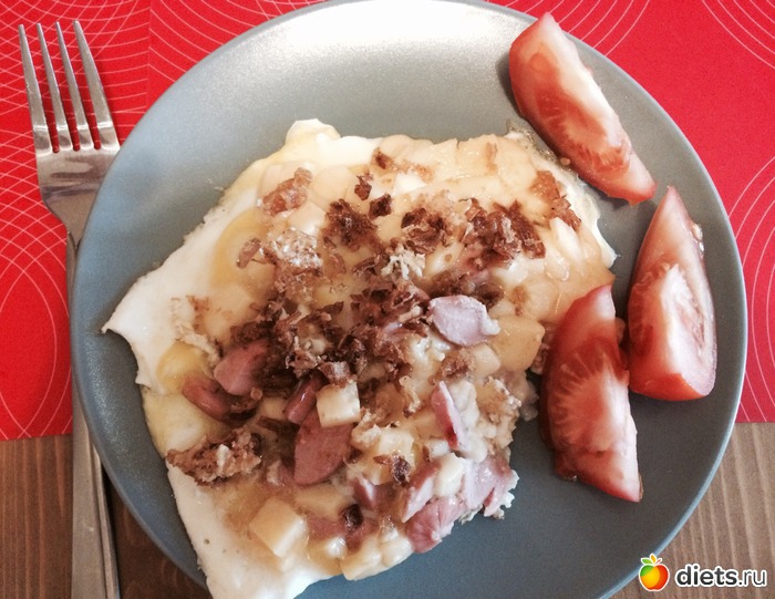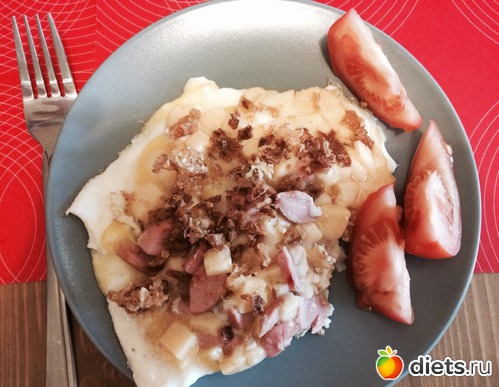 Яйцо с сосисками под сыром с карамелизированным луком