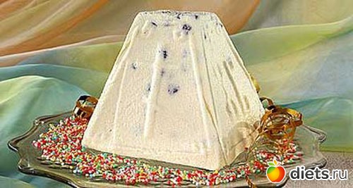 2 кг творога протереть через сито смешать с 400 гр сливочного масла, добавить 800гр сметаны, 4-5 стаканов сахарного песка растертого с 5 желтками, немного ванилина 200 гр цукатов, чуть более 1 стакана изюма 100гр измельченного миндаля (ожно то что вам больше нравится или все вместе)