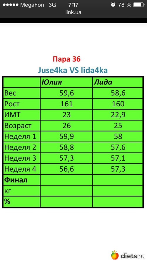 Кстати, участвую в дуэльке похудательной. У меня замечательная половинка! И вот наши результаты прошлых неделек.