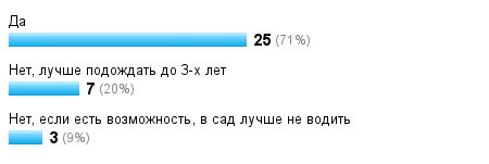 А вообще, я ЗА! Мне кажется, что в коллективе лучше развиваются самостоятельные навыки. Сама в сад не ходила, т.к. мама сидела в декрете с братом, но в сознательном возрасте завидовала, т.к. мой закадычный друг туда ходил и развлечений там было на порядок больше, чем у меня дома. Опять же многое зависит от занятости мамы, я физически не могу уделить весь день ребенку, т.к. на мне все домашние дела, если же есть помощники, почему бы и нет.