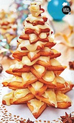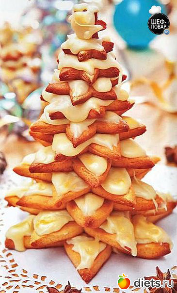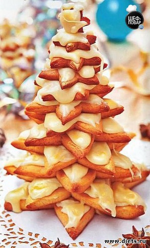 • Белый шоколад наломайте кусочками и растопите на горячей водяной бане. Нанесите его на готовые звездочки и сложите в виде елочки. Также по желанию блюдо можно украсить кондитерской посыпкой, «бусинками». Дайте шоколаду застыть.’