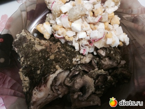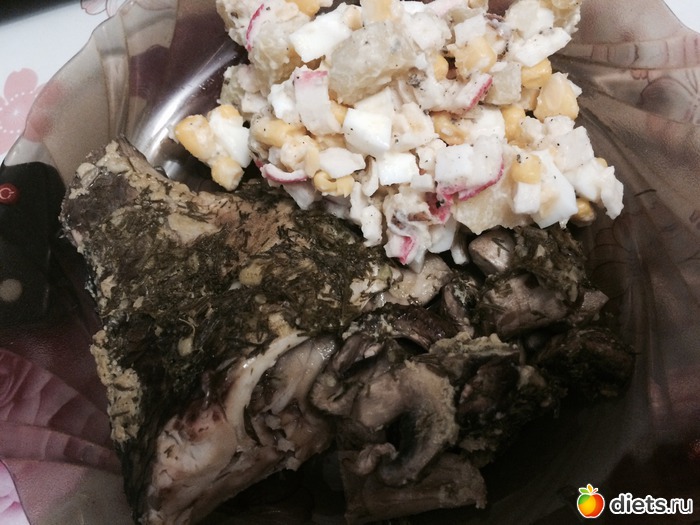 Запеченный карась с шампиньонами и салат( крабовый палочки, кукуруза, яйцо, картофель) заправленный нат. Йогуртом