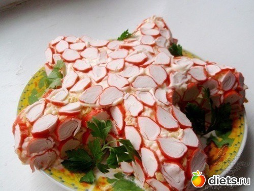 4. Дальше выкладываем салатик слоями (придавая ему форму морской звезды). Первый слой – нарезанные огурцы, затем картошка, яйца, морковь. Каждый слой промазываем майонезом.