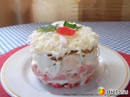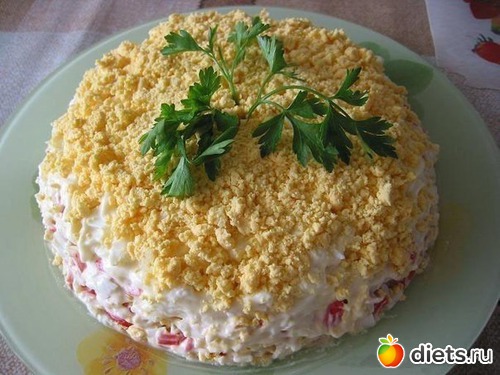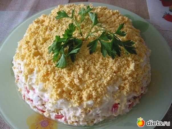 Салат выкладывать слоями. Все слои промазывать майонезом.