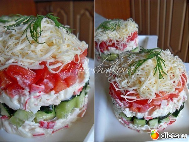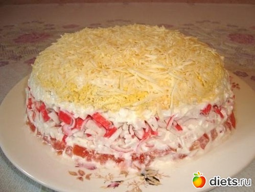Выкладываем салат слоями: мелко нарезанные помидоры (если они очень сочные, сок лучше слить) - крабовые палочки - белки яиц (натереть на терке) - натертые желтки - тертый сыр. Все слои промазать майонезом.