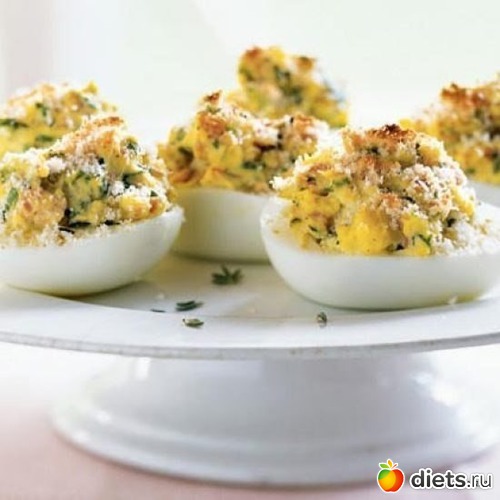 25. Гусиную печень нарезать тонкими ломтиками и обжарить вместе с нарезанным кольцами луком, перемешать желтки со сливочным маслом и соусом бешамель, заправить солью, черным перцем и коньяком, фаршированные яйца полить сверху белым соусом.